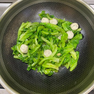 步骤4、炒均匀后加入适量香菇丸子,炒几下