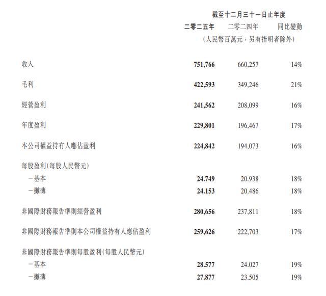 2025年,腾讯控股实现营业收入7517.66亿元,同比增长14%;取得经营盈利2415.62亿元,同比增长16%;年度盈利2298.01亿元,同比增长17%。