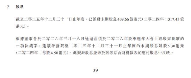 截至2025年12月31日止年度,公司已派发末期股息共计409.66亿港元(2024年:317.43亿港元)。据董事会于2026年3月18日通过之决议,建议就该年度派发末期股息,每股5.30港元(2024年:每股4.50港元),该拟派股息尚未在综合财务报表中列为应付股息。该派息方案尚须经2026年股东周年大会批准方可生效。此次股息水平提升反映公司盈利状况及回报股东的政策取向。