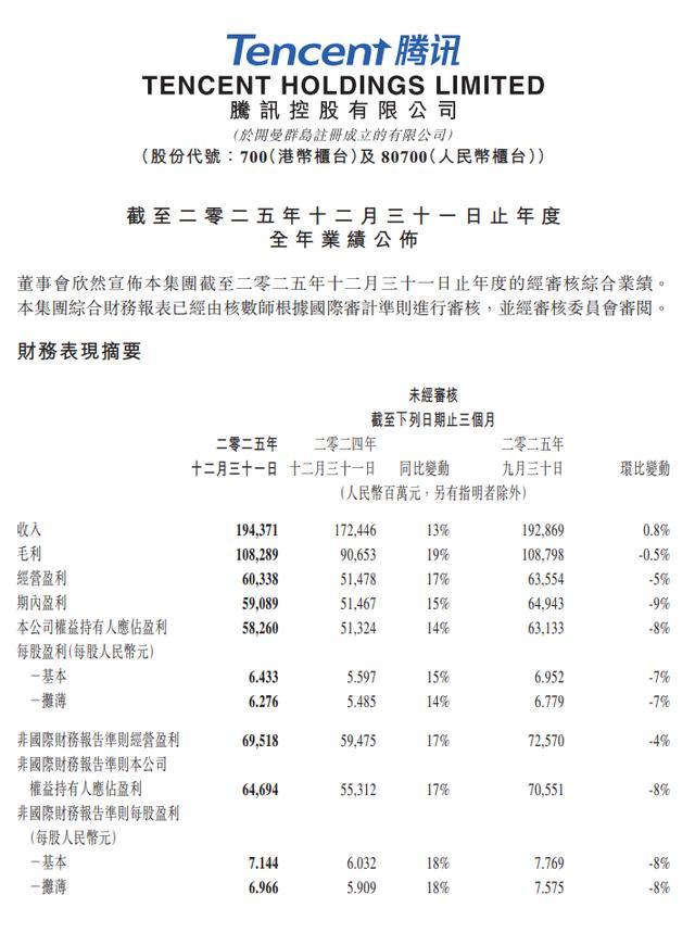 3月18日,腾讯控股(00700.HK)发布2025年第四季度及全年业绩,第四季度营收1,943.7亿元人民币,同比增长13%;净利润582.6亿元人民币,同比增长14%。
