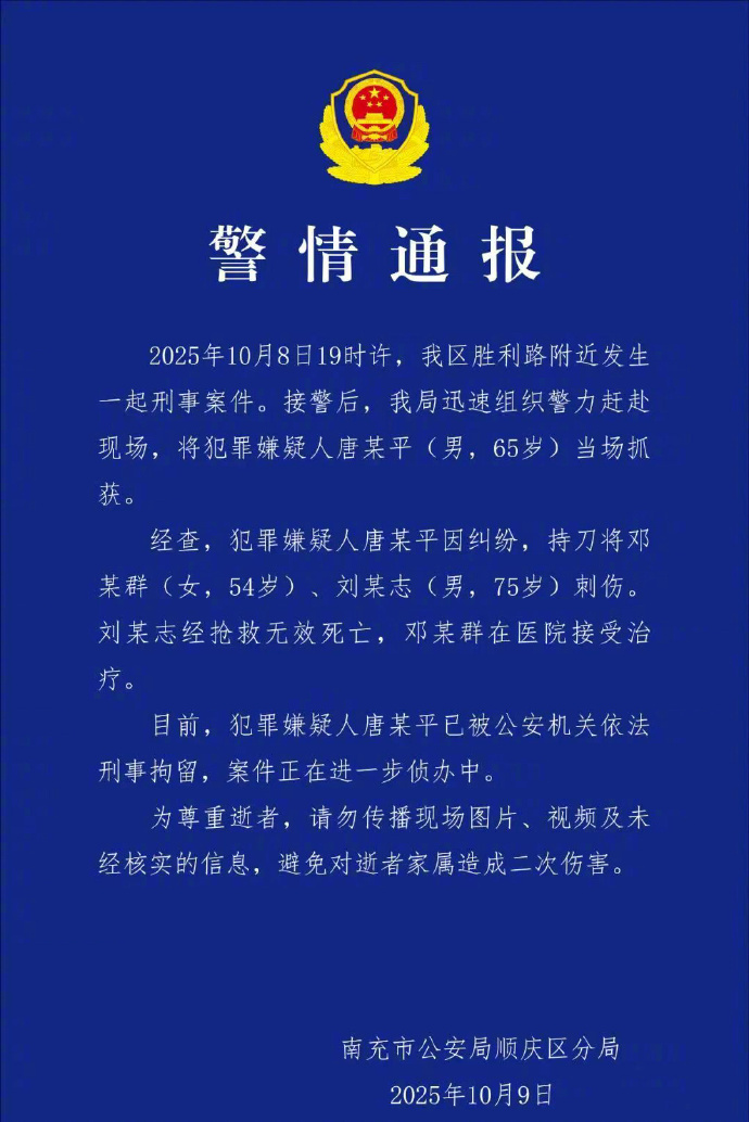 2025年10月9日,四川南充市公安局顺庆区分局针对辖区内一起刑事案件发布警情通报。通报称:2025年10月8日19时许,我区胜利路附近发生一起刑事案件。接警后,我局迅速组织警力赶赴现场,将犯罪嫌疑人唐某平(男配资实力股票配资平台,65岁)当场抓获。